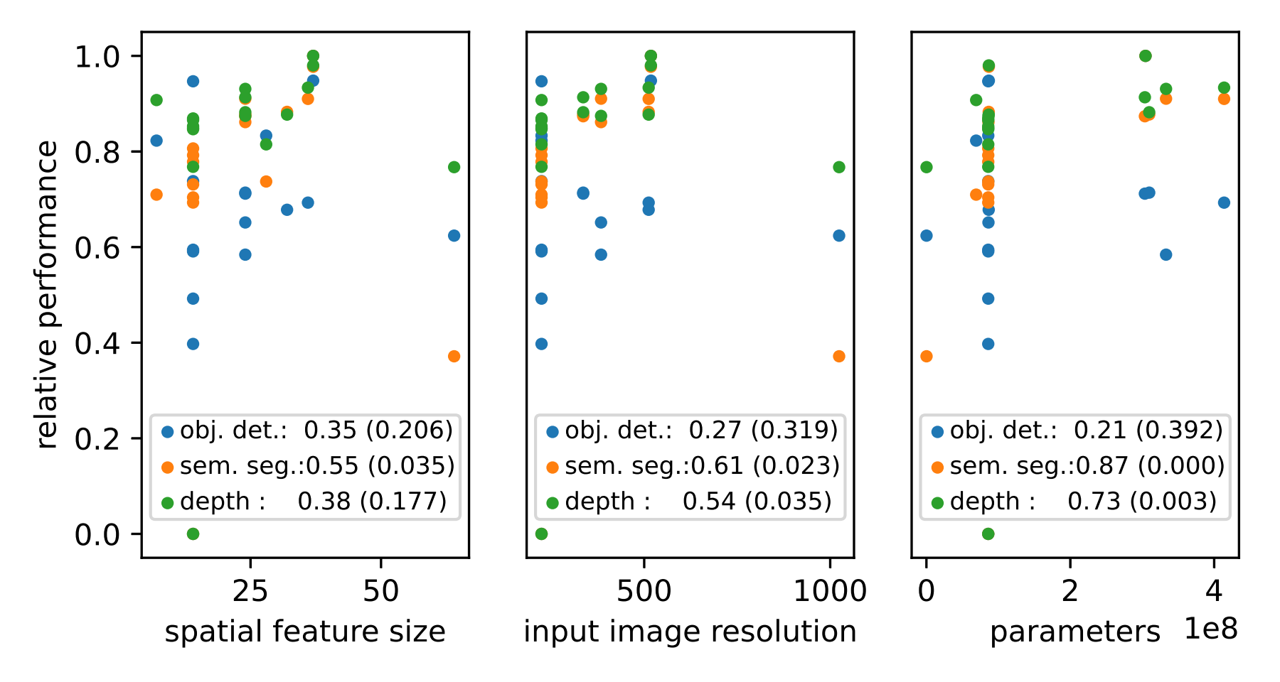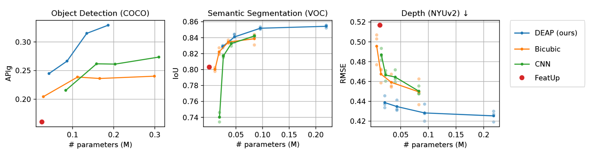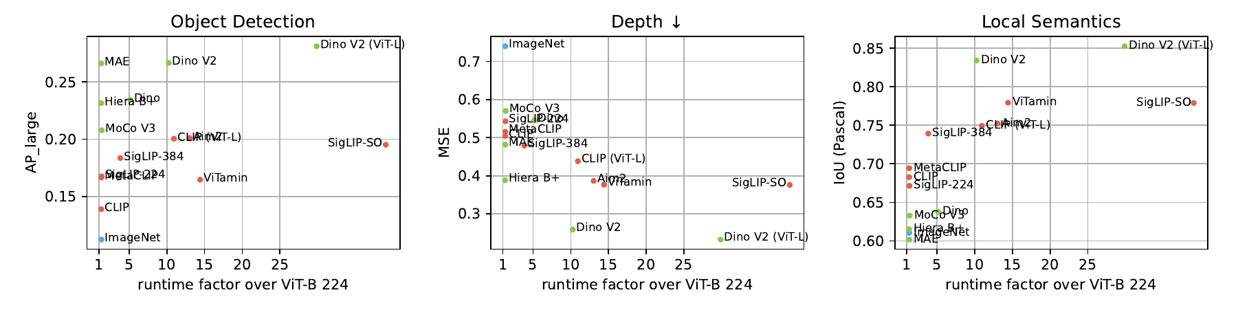 We train Dense Attentive Probing as a readout on top of several frozen backbones and evaluate downstream task performances for dense prediction tasks. Due to its small number of parameters, we can measure dense prediction performance directly, similar to linear probing for tasks that involve the whole image. These are our results:
