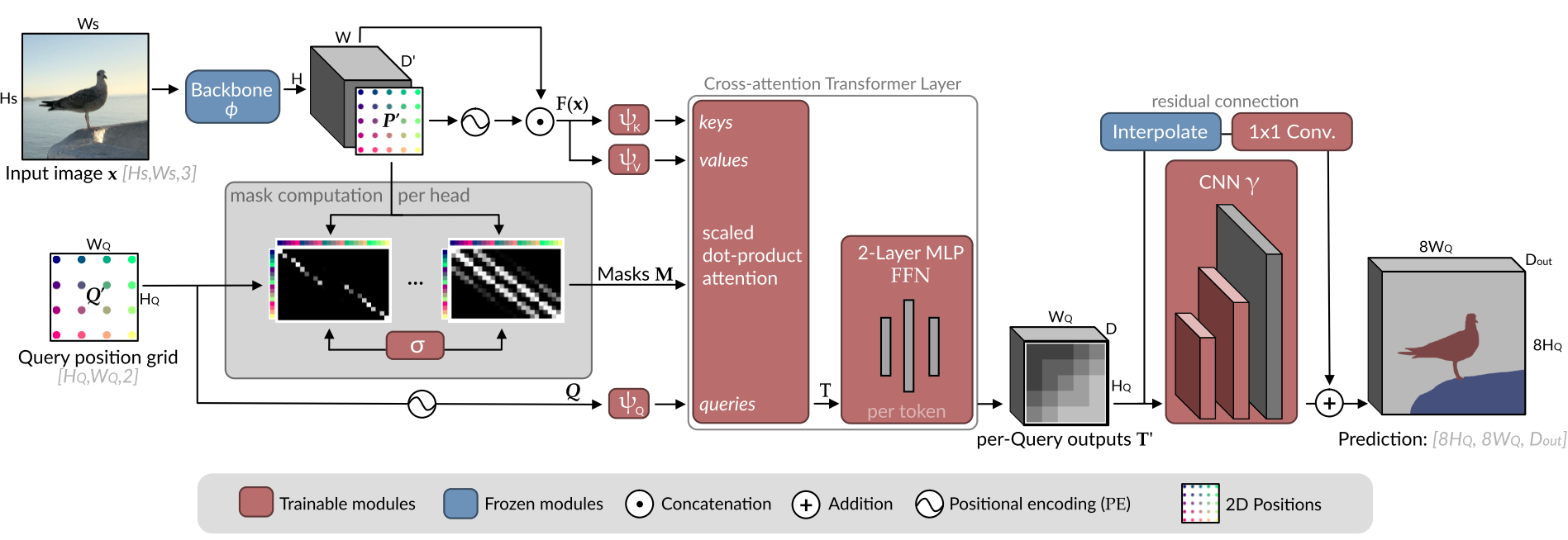 The idea of Dense Attentive Probing is to use cross-attention as a minimal task head on top of frozen backbones. Frozen means that no weights can be changed. Due to the small number of parameters, we directly assess the quality of the backbone's features for the respective task.