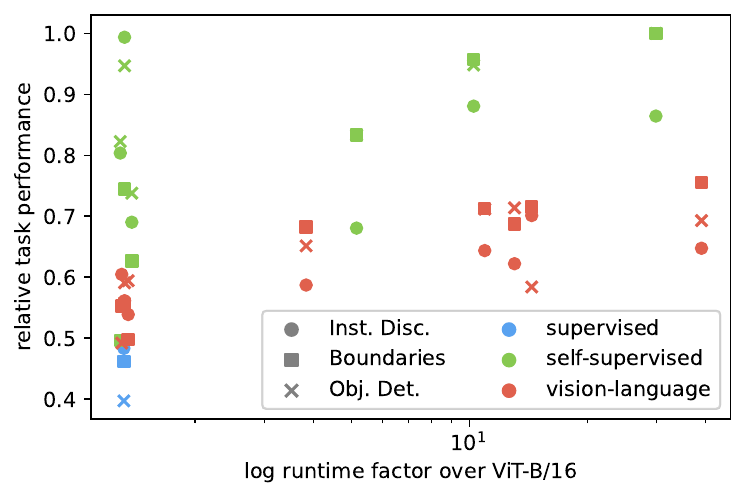 The paradigm of pretraining a backbone on a large set of (often unlabeled) images has gained popularity. The quality of the resulting features is commonly measured by freezing the backbone and training different task heads on top of it. However, current evaluations cover only classifications of whole images or require complex dense task heads which introduce a large number of parameters and add their own inductive biases. In this work, we propose dense attentive probing, a parameter-efficient readout method for dense prediction on arbitrary backbones -- independent of the size and resolution of their feature volume. To this end, we extend cross-attention with distance-based masks of learnable sizes. We employ this method to evaluate 18 common backbones on dense predictions tasks in three dimensions: instance awareness, local semantics and spatial understanding. We find that DINOv2 outperforms all other backbones tested -- including those supervised with masks and language -- across all three task categories. Furthermore, our analysis suggests that self-supervised pretraining tends to yield features that separate object instances better than vision-language models.